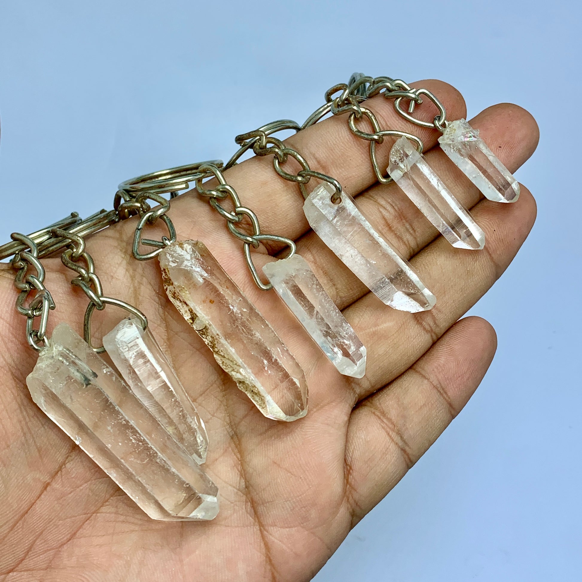 Natural Material: Each key chain features a piece of real Quartz, often cut and polished into a smooth point or tumble stone, showcasing its natural clarity, inclusions, and unique form.
